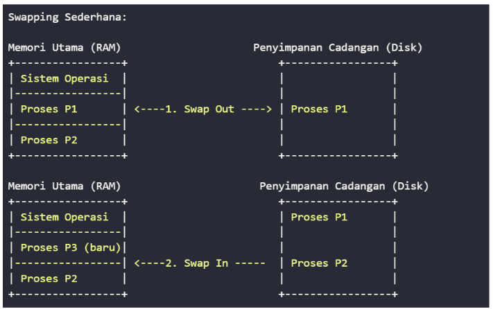 - Swapping itu proses mindahin seluruh program (atau sebagian) dari memori utama (RAM) ke penyimpanan cadangan (biasanya disk cepat), terus nanti dibawa balik lagi ke RAM kalau mau dijalanin lagi. Ini bikin seolah-olah RAM kita lebih besar, jadi bisa ngejalanin lebih banyak program. Program yang lagi nganggur bisa di-swap out (dikeluarin ke disk) biar RAM-nya bisa dipakai program yang lagi aktif. Nanti kalau program nganggur itu aktif lagi, dia di-swap in (dimasukin lagi ke RAM).