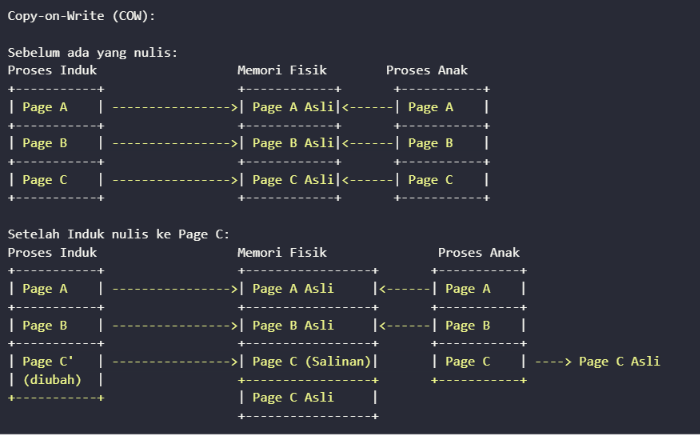 - Pembuatan Proses Lebih Cepat: Teknik seperti Copy-on-Write memungkinkan proses baru dibuat dengan cepat tanpa menyalin seluruh memori induknya.