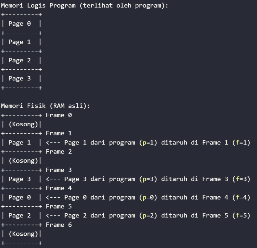 - Menghilangkan Fragmentasi Eksternal: Karena proses dapat ditempatkan di frame fisik mana pun yang tersedia, tidak perlu lagi mencari blok memori kosong yang berdekatan.