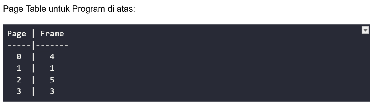 Page Table Buat nerjemahin alamat logis (p, d) jadi alamat fisik (lokasi beneran di RAM), ada tabel khusus namanya page table (tabel halaman). Setiap program punya page table sendiri. Isinya: buat tiap nomor halaman (p) dari program itu, dia disimpan di nomor bingkai (f) mana di RAM. Jadi, MMU bakal: