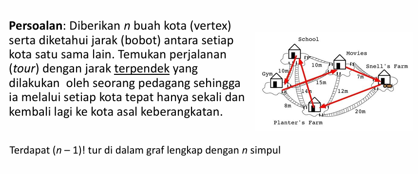 nbuah kota beserta jarak (bobot) antar kota, seorang pedagang harus menemukan rute perjalanan (tur) terpendek.- Syarat: Tur harus melalui setiap kota tepat satu kali dan kembali ke kota asal.