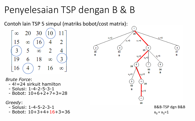 - Implementasi: Tantang diri Anda untuk mengimplementasikan B&B dengan metode Matriks Ongkos Tereduksi untuk TSP. Ini adalah proyek pemrograman yang sangat baik untuk memahami algoritma secara mendalam.