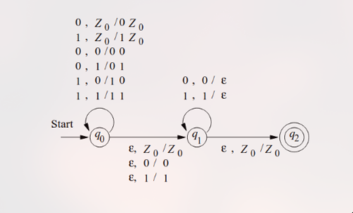 PDA ini menggunakan non-determinisme untuk “menebak” di mana titik tengah string (batas antara dan ).