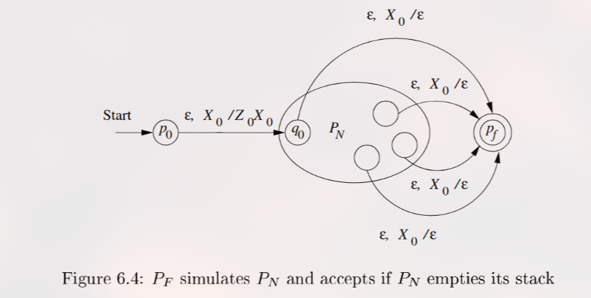 Ide: Kita akan membuat PDA baru yang mensimulasikan . akan menambahkan “penanda dasar” di stack. Jika berhasil mengosongkan stack-nya, akan “melihat” dan segera pindah ke final state baru, .