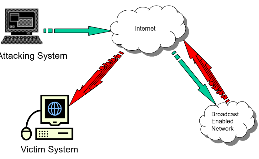 - Smurf Attack: Ini adalah jenis serangan amplification. Penyerang mengirimkan ICMP Echo Request (ping) ke alamat broadcast sebuah jaringan, namun dengan memalsukan alamat IP sumber menjadi alamat IP korban. Akibatnya, semua host aktif di jaringan tersebut akan serentak mengirimkan balasan ping ke korban, membanjiri lalu lintasnya.