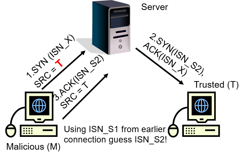 SYN(permintaan koneksi) ke server. Server akan merespons denganSYN-ACKdan mengalokasikan sumber daya untuk koneksi yang “setengah terbuka” ini. Namun, penyerang tidak pernah menyelesaikan handshake dengan mengirimACKterakhir. Ini menyebabkan antrian koneksi server menjadi penuh dan tidak dapat menerima koneksi yang sah.- TCP Session Poisoning: Serangan yang mengirim paket RST (Reset) untuk memutuskan koneksi TCP secara paksa. Penyerang tidak perlu menebak sequence number yang tepat - cukup sequence number yang berada dalam jangkauan window TCP, dan untuk window 64k diperlukan sekitar 64.000 paket atau 15 detik pada koneksi T1 untuk berhasil mereset koneksi.