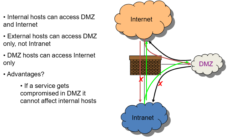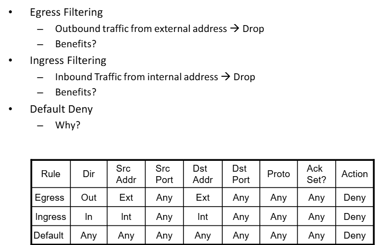 - Aturan penting: Ingress Filtering (memblokir lalu lintas dari luar yang alamat sumbernya dipalsukan seolah dari dalam) dan Egress Filtering (memblokir lalu lintas dari dalam yang alamat sumbernya tidak sah).