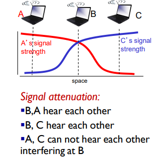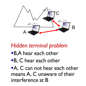 Hidden Terminal Problem: Sebuah masalah klasik di mana dua host (misal A dan C) berada di luar jangkauan satu sama lain, namun keduanya berada dalam jangkauan AP (B) yang sama. Akibatnya, A dan C mungkin mengirim data ke B secara bersamaan tanpa menyadari keberadaan satu sama lain, yang menyebabkan tabrakan (collision) di AP.