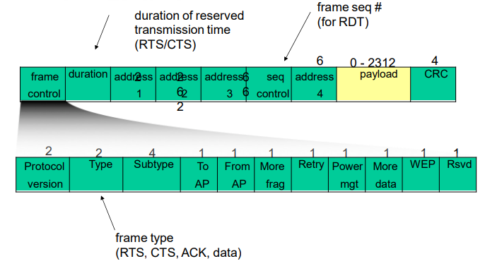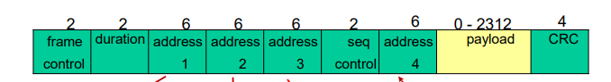 Frame 802.11 memiliki hingga empat field alamat (masing-masing 6 byte), berbeda dengan frame Ethernet yang hanya punya dua. Ini diperlukan untuk menangani skenario di mode infrastruktur.