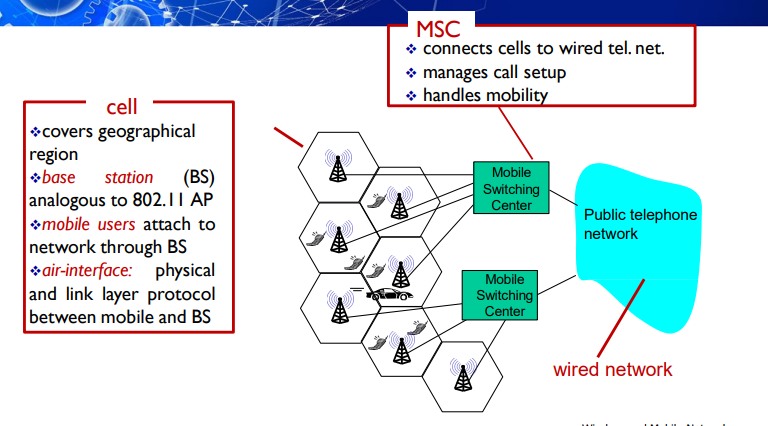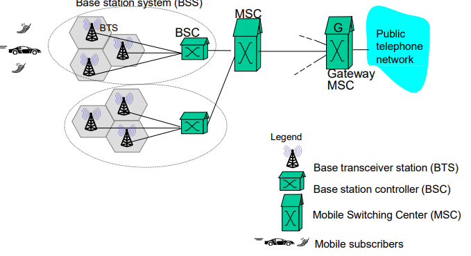 - Mobile Switching Center (MSC): Pusat dari beberapa BS. Bertugas mengelola pengaturan panggilan, menghubungkan jaringan seluler ke jaringan telepon kabel publik (PSTN), dan menangani handoff (perpindahan pengguna dari satu sel ke sel lain).
