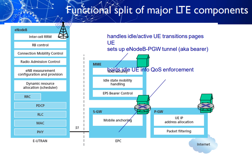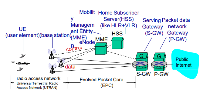 - Arsitektur 4G LTE lebih sederhana dan datar, dengan komponen inti yang memisahkan fungsi kontrol (MME) dan fungsi data (S-GW untuk mobilitas internal dan P-GW sebagai gerbang ke internet).