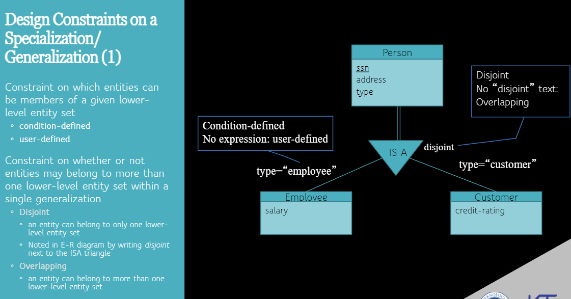 - Overlapping: Sebuah entitas bisa menjadi anggota dari beberapa subclass secara bersamaan (misalnya, seseorang bisa menjadi mahasiswa sekaligus instruktur)(Default).
