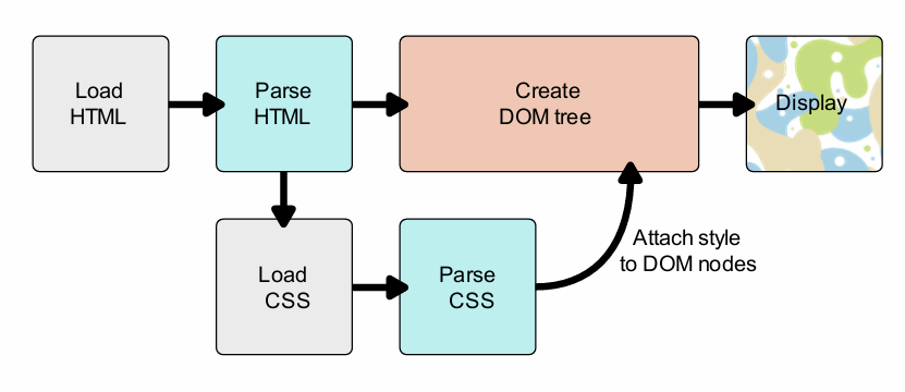 Browser pertama-tama memuat dan mem-parsing HTML untuk membuat struktur pohon yang disebut DOM (Document Object Model). Setelah itu, browser akan memuat dan mem-parsing file CSS. Aturan-aturan gaya dari CSS kemudian “ditempelkan” ke node-node yang sesuai di dalam DOM sebelum halaman akhirnya dirender dan ditampilkan kepada pengguna.