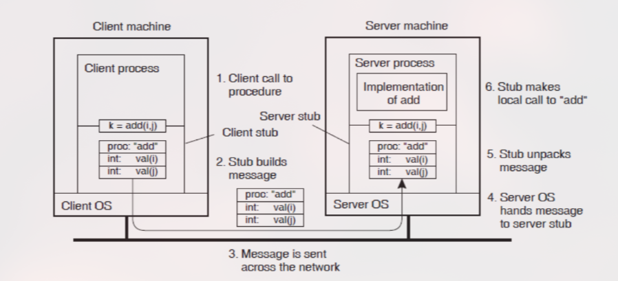 Client stub memanggil OS lokal untuk mengirim pesan ke server machine.