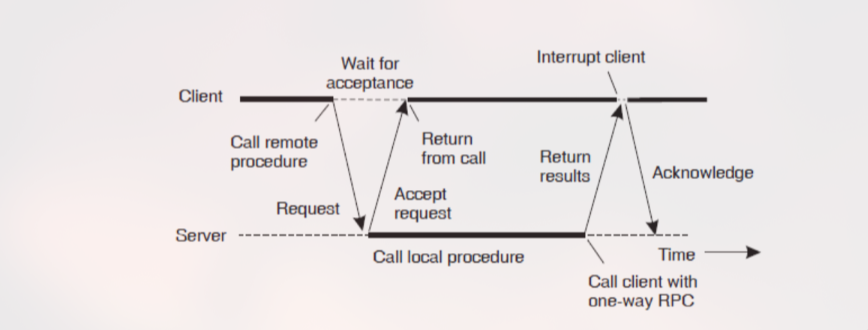 Deferred Synchronous RPC (c): Client melakukan call (b), lalu lanjut kerja. Server (setelah selesai proses) memanggil client kembali (menggunakan one-way RPC) untuk memberikan hasilnya.