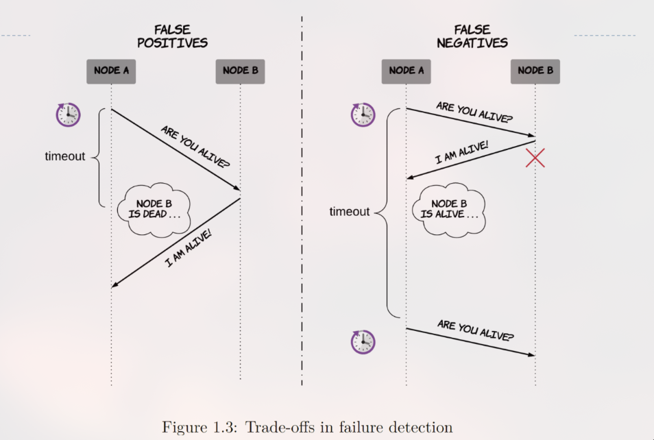 False Negative: Node A mengira Node B hidup (karena balasan terakhirnya masih dalam timeout window), padahal Node B baru saja crash setelah mengirim balasan itu.