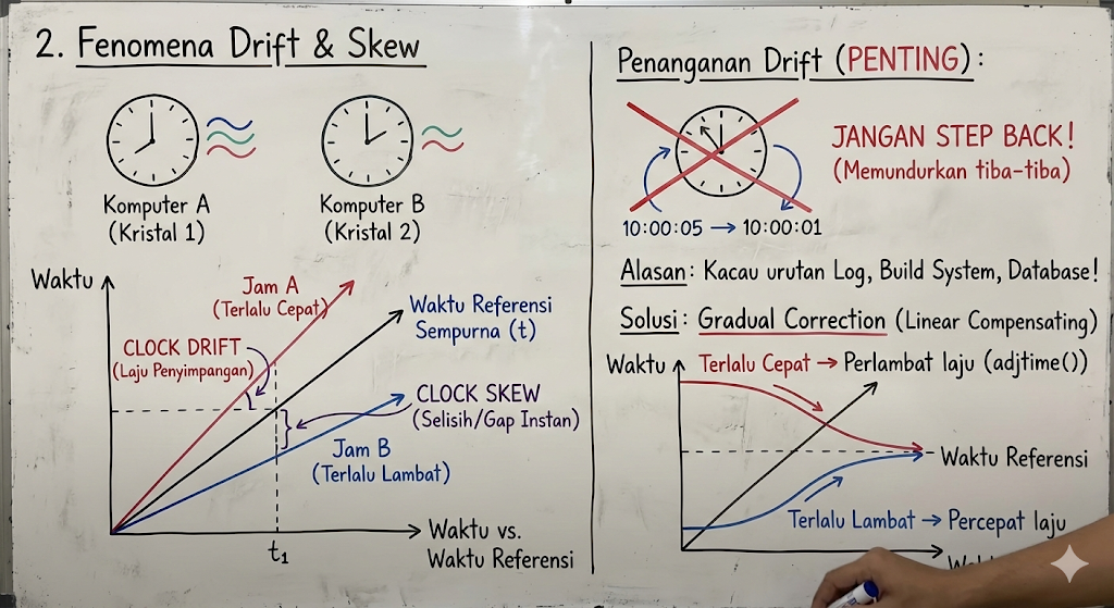 Sinkronisasi waktu fisik terkendala oleh ketidaksempurnaan hardware (Quartz drift) dan variabilitas latensi jaringan. Prinsip utamanya adalah koreksi harus dilakukan secara gradual (monotonic), jangan pernah memundurkan jam. Algoritma Cristian cocok untuk klien yang mengontak server waktu, Algoritma Berkeley cocok untuk kesepakatan internal tanpa sumber eksternal, sedangkan NTP menyediakan arsitektur hierarkis (Stratum) yang toleran kesalahan untuk skala internet.