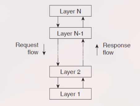 Sebuah request mengalir ke bawah (dari Layer N ke N-1, … ke Layer 1).