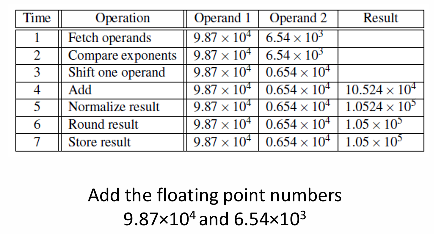 Contoh: Misalkan operasi penjumlahan floating point membutuhkan 7 tahap (Fetch, Compare, Shift, Add, Normalize, Round, Store), dan setiap tahap butuh 1 nanosekon.