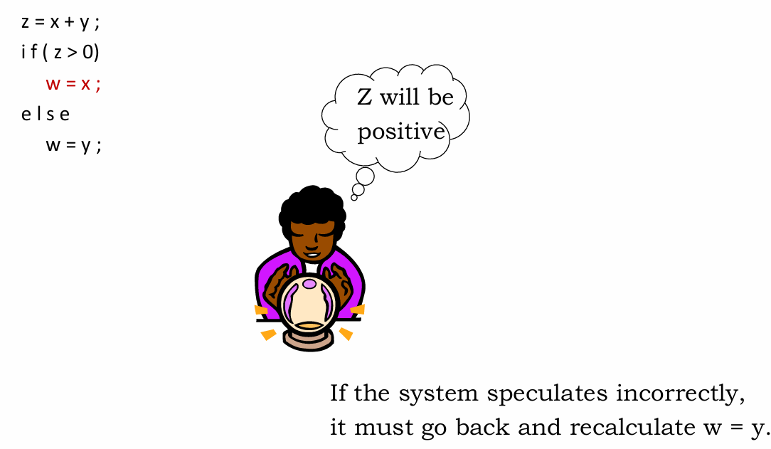 if-else) karena prosesor tidak tahu jalur mana yang harus dieksekusi. Untuk mengatasinya, digunakan spekulasi: prosesor “menebak” hasil dari percabangan dan mulai mengeksekusi instruksi di jalur yang paling mungkin agar unit eksekusi tidak menganggur.