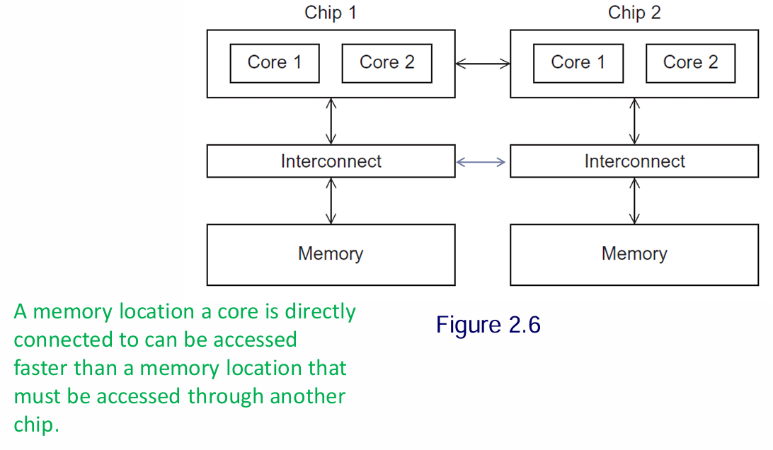NUMA (Non-Uniform Memory Access): Terdiri dari beberapa chip prosesor. Sebuah core dapat mengakses memori yang terhubung langsung dengannya lebih cepat daripada memori yang terhubung ke chip lain.