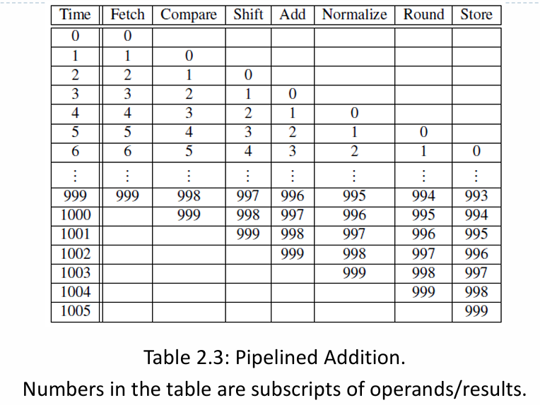 for i=0 to 999, z[i]=x[i]+y[i]), total waktu yang dibutuhkan adalah1000 * 7 ns = 7000 ns.Dengan Pipelining: Hasil pertama keluar pada nanosekon ke-7. Namun, hasil kedua keluar pada nanosekon ke-8, hasil ketiga pada nanosekon ke-9, dan seterusnya. Total waktu untuk 1000 penjumlahan menjadi