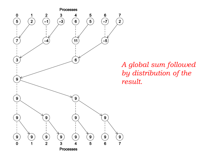 // Semua proses memanggil dalam urutan yang samaMPI_Reduce(&local_a, &global_a, 1, MPI_INT, MPI_SUM, 0, MPI_COMM_WORLD);MPI_Reduce(&local_b, &global_b, 1, MPI_INT, MPI_SUM, 0, MPI_COMM_WORLD);