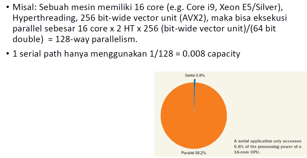 Gene Amdahl, seorang arsitek komputer, merumuskan sebuah hukum yang menyatakan bahwa percepatan (speedup) sebuah program yang diparalelkan akan dibatasi oleh bagian dari program tersebut yang tidak bisa diparalelkan (bagian serial). Misalnya, jika 10% dari program Anda harus berjalan secara serial, maka seberapa banyak pun core yang Anda tambahkan, program Anda tidak akan pernah bisa berjalan lebih dari 10 kali lebih cepat. Ini menunjukkan betapa pentingnya mengidentifikasi dan meminimalkan bagian serial dalam sebuah algoritma.