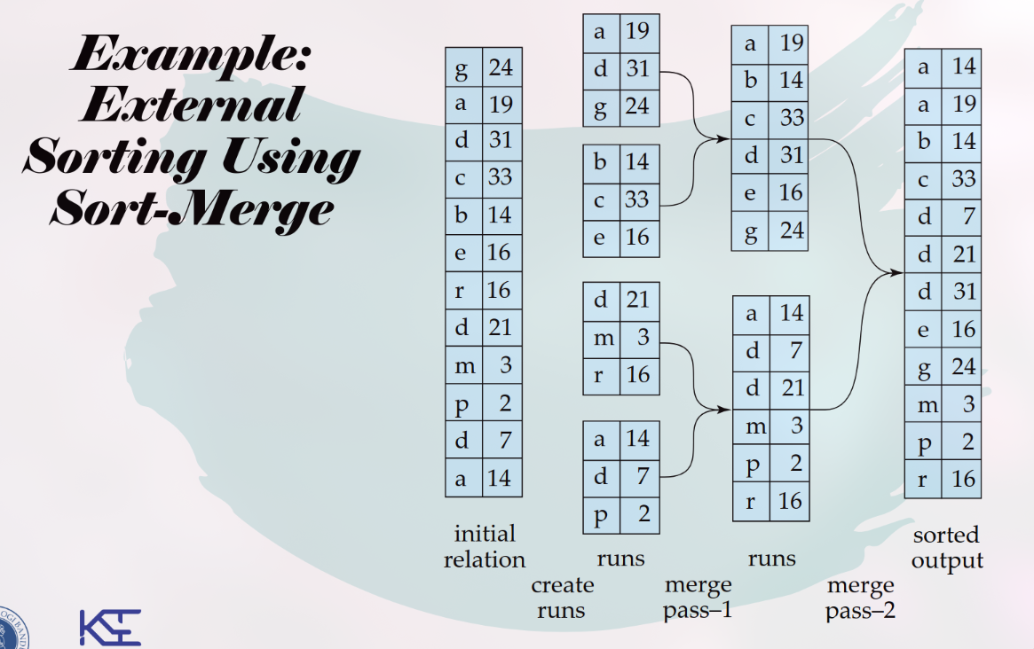 External Sort-Merge adalah algoritma standar untuk mengurutkan relasi yang ukurannya melebihi memori utama, yang bekerja dalam dua fase: membuat sejumlah run terurut dan kemudian menggabungkan run-run tersebut. Jika jumlah run melebihi kapasitas memori, penggabungan dilakukan dalam beberapa pass. Biaya totalnya, yang diukur dalam transfer blok dan seeks, sangat bergantung pada ukuran memori (M) karena ini menentukan berapa banyak pass penggabungan yang diperlukan untuk menyelesaikan seluruh proses.