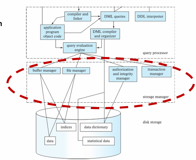 Buffer Manager: Bertanggung jawab untuk mengambil data dari disk dan menyimpannya sementara di memori utama (RAM). Komponen ini juga yang memutuskan data apa yang akan disimpan di cache untuk akses yang lebih cepat.