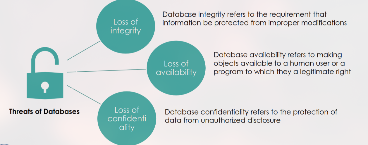 Loss of Availability (Kehilangan Ketersediaan): Jaminan bahwa data dan layanan database dapat diakses oleh pengguna yang sah kapan pun dibutuhkan. Contoh: Serangan DDoS (Denial of Service) yang membuat server database tidak bisa diakses.
