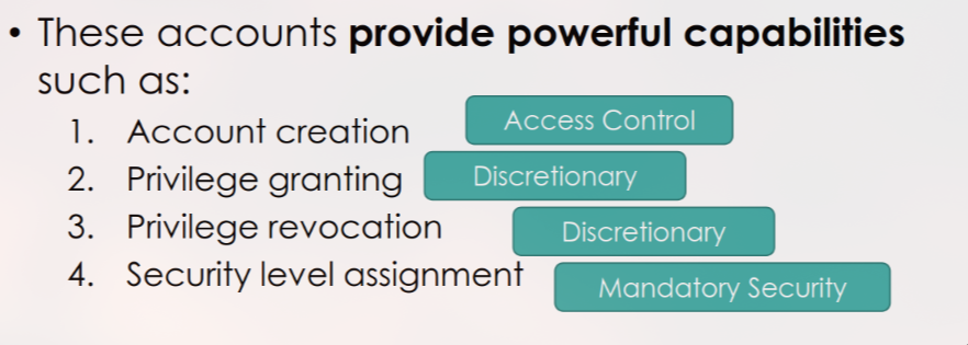 Discretionary Security: Memberikan privileges (hak istimewa) seperti