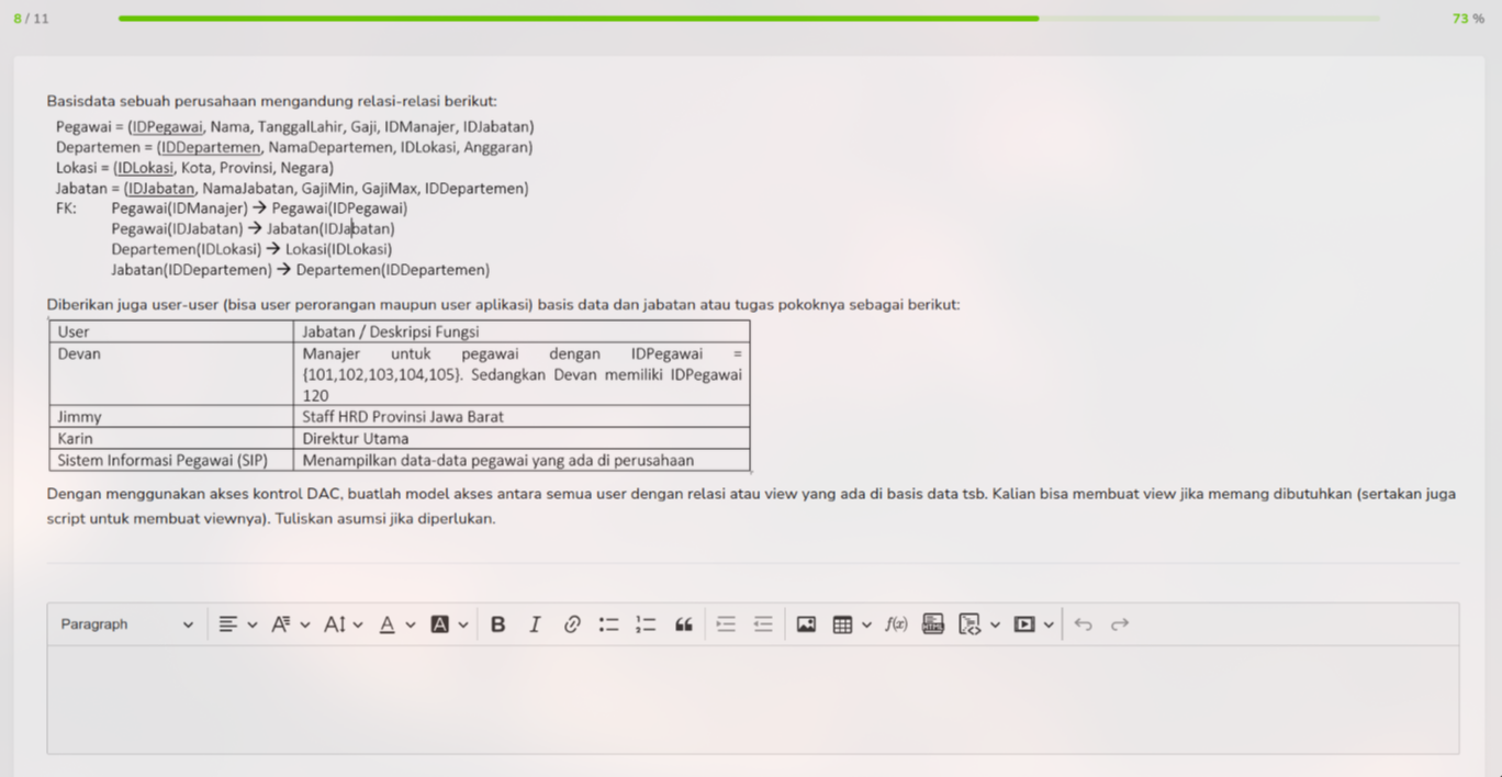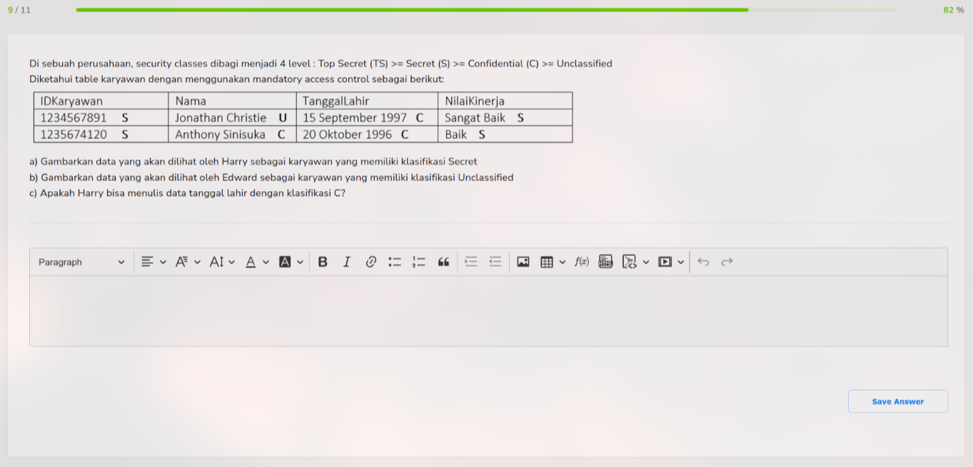 a. Harry sebagai S, berdasarkan Simple Security Property, akan melihat (Read) seluruh data dalam Tabel Karyawan (karena tidak ada role yang lebih tinggi isi datanya daripada S) Gambaran data: