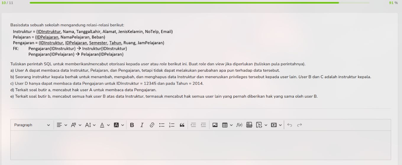 GRANT SELECT ON Instruktur, Pelajaran, Pengajaran TO User_A;CREATE ROLE head_instructor;