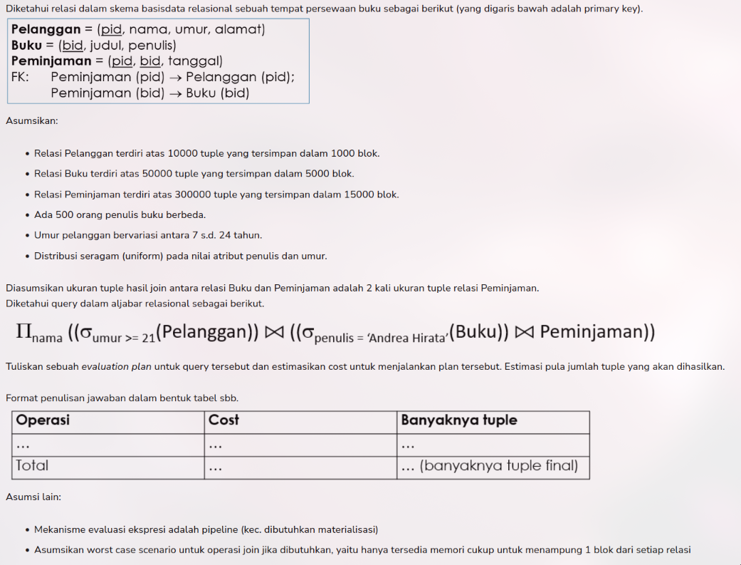 - Blok Hasil #3 (berdasarkan asumsi soal): tuples per block peminjaman = 300.000 / 15.000 = 20. Ukuran tuple hasil join 2x lipat, jadi tuples per block hasil3 = 10. Maka blok