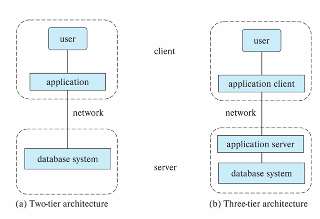 Three-Tier Architecture: Arsitektur yang lebih modern dan menjadi standar untuk aplikasi web. Mesin client hanya bertindak sebagai front-end (misalnya, browser) dan tidak berisi logika database. Client berkomunikasi dengan sebuah application server, dan application server inilah yang kemudian berkomunikasi dengan sistem basis data untuk mengakses data.