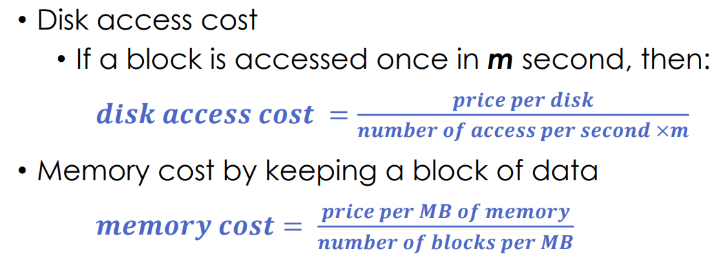 Pada tahun 1987, harga per disk adalah 5.000 dengan ukuran blok 1KB. Anggap kita memiliki blok data yang diakses sekali per 2 detik, maka: