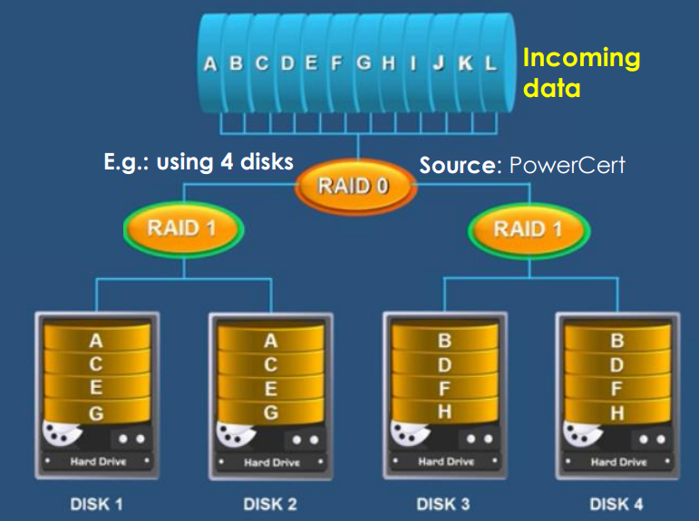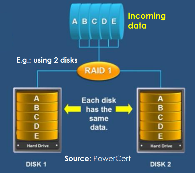 RAID 1: Sering digunakan untuk disk sistem operasi, di mana reliabilitas adalah segalanya dan kapasitas tidak terlalu besar.