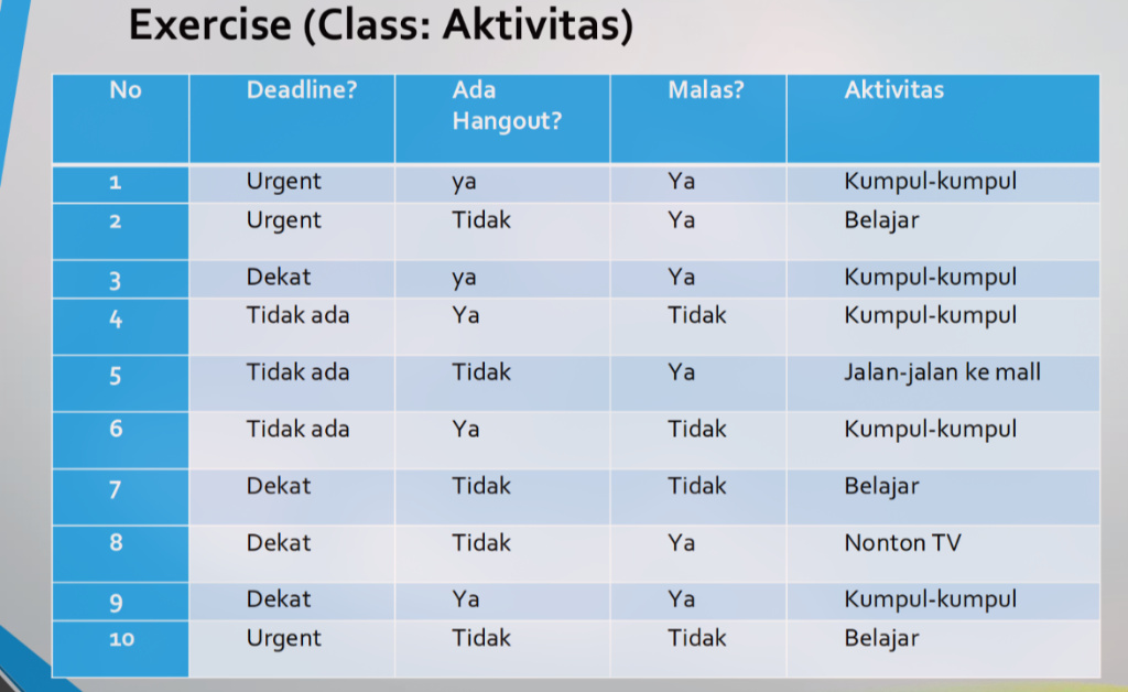 Data Latih (Set S): Total 10 instans Kelas Target (Aktivitas): 4 kelas
