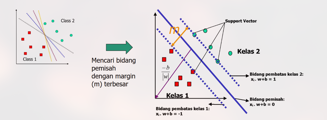 Jika hasilnya , maka data tersebut berada tepat di garis pembatas. Data inilah yang disebut Support Vector.