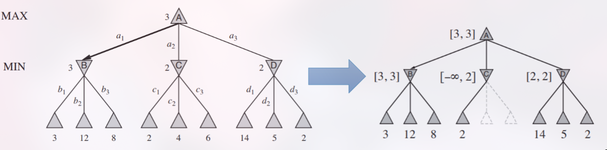 Contoh dari slide: Setelah mengevaluasi cabang B, MAX tahu ia bisa mendapatkan skor minimal 3 (α = 3). Kemudian saat mengevaluasi cabang C, MIN menemukan langkah dengan nilai 2. Pada titik ini, nilai pada simpul C dijamin akan ≤ 2 (β = 2). Karena α (3) ≥ β (2), sisa anak dari C tidak perlu dievaluasi. MAX tidak akan pernah memilih cabang C karena sudah ada cabang B yang lebih baik.
