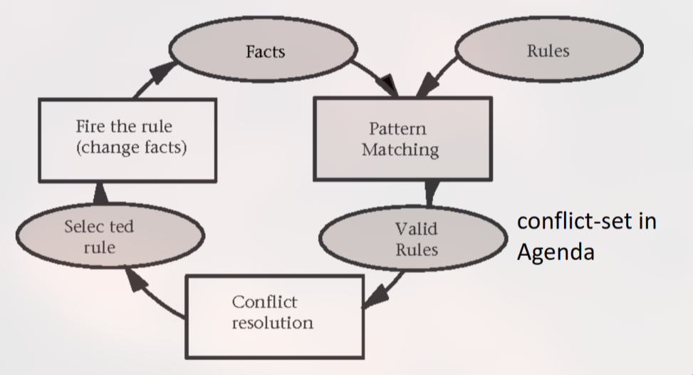 Conflict Resolution: Semua aturan yang LHS-nya terpenuhi oleh fakta akan dimasukkan ke dalam sebuah himpunan yang disebut Conflict Set (atau Agenda). Dari himpunan ini, satu aturan dipilih untuk dieksekusi berdasarkan strategi resolusi konflik.